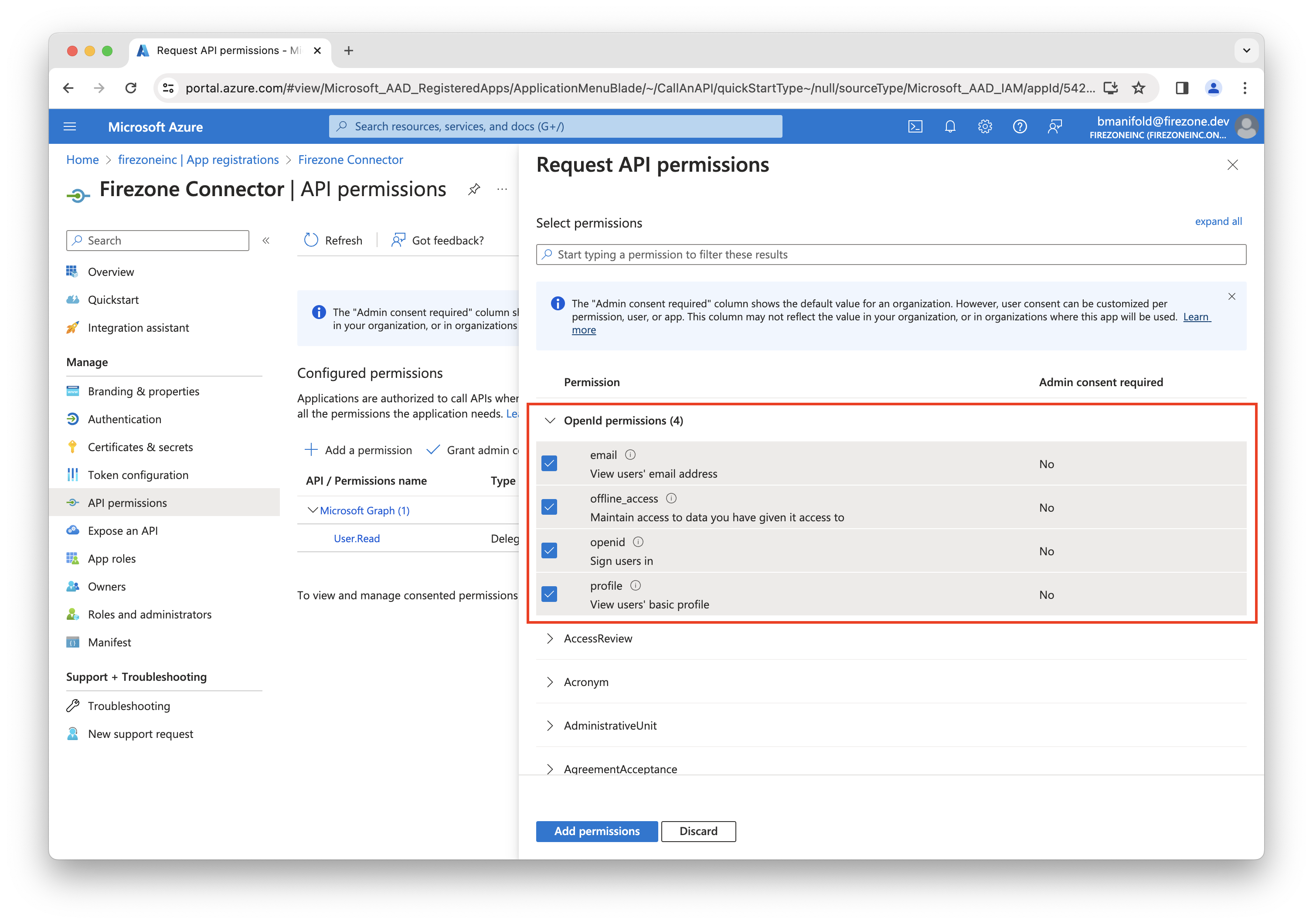 In the next screen, ensure the following OpenId permissions are selected: