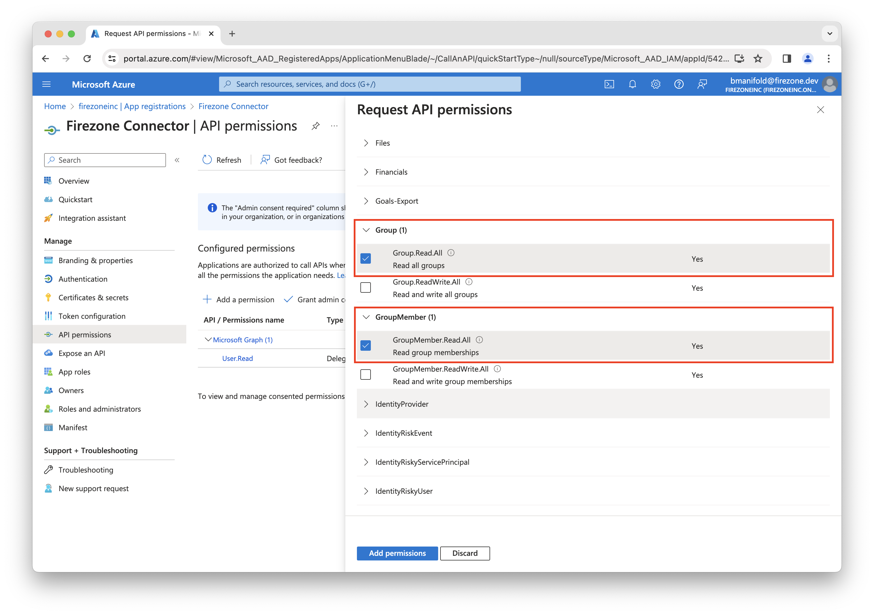 Next, you'll need to add permissions to the app registration to allow Firezone to read user and group data from your Entra ID account.