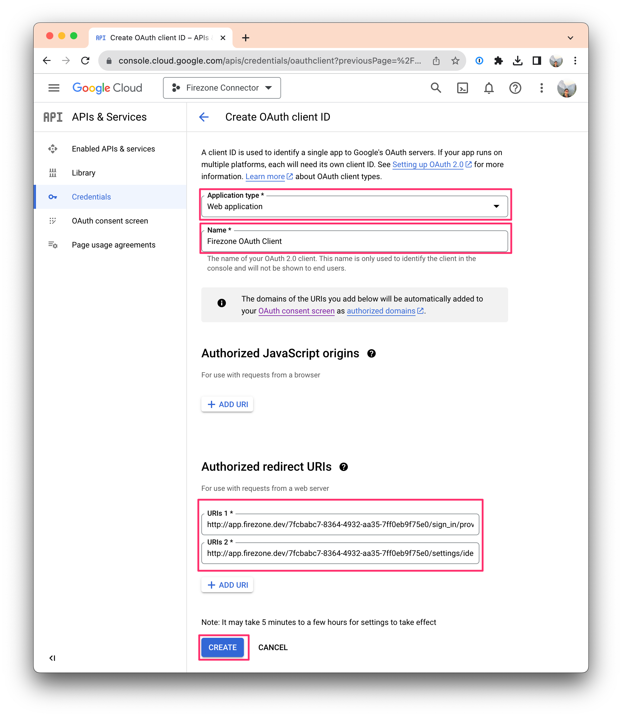 Firezone OAuth Client - Authorized redirect URIs: Click ADD URI, and enter the two redirect