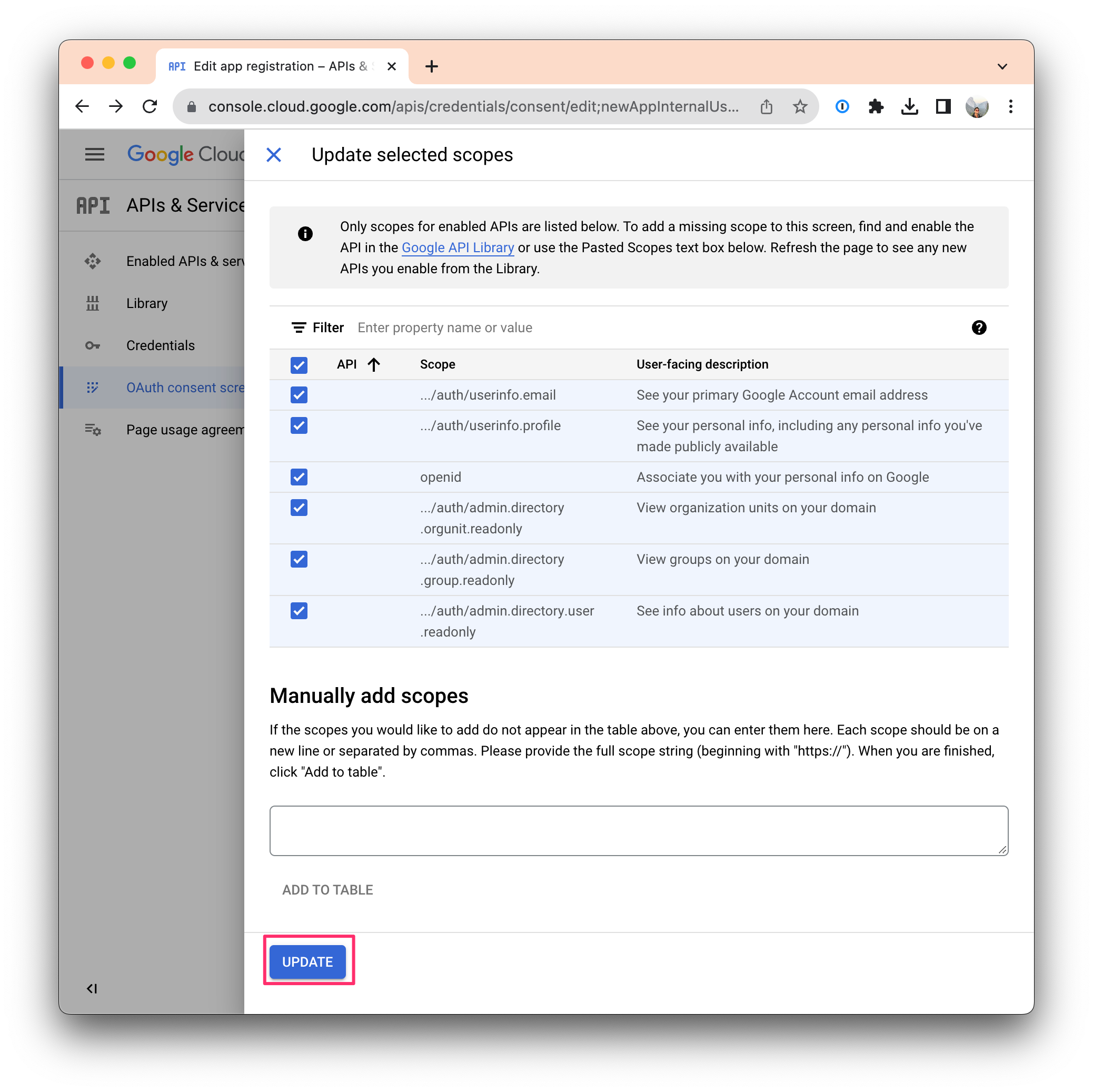 If you're on the Enterprise plan, you'll need to add the following additional scopes to sync users, groups, and organizational units: