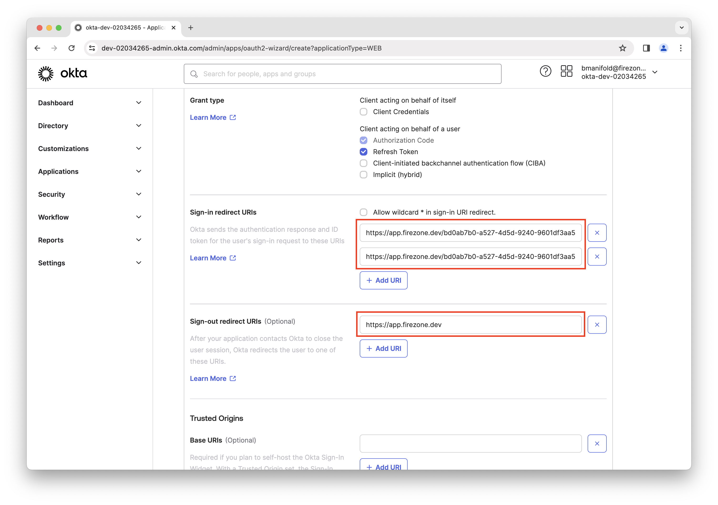 In the Sign-in redirect URIs field, enter the redirect URIs shown in the setup form in your Firezone admin portal.