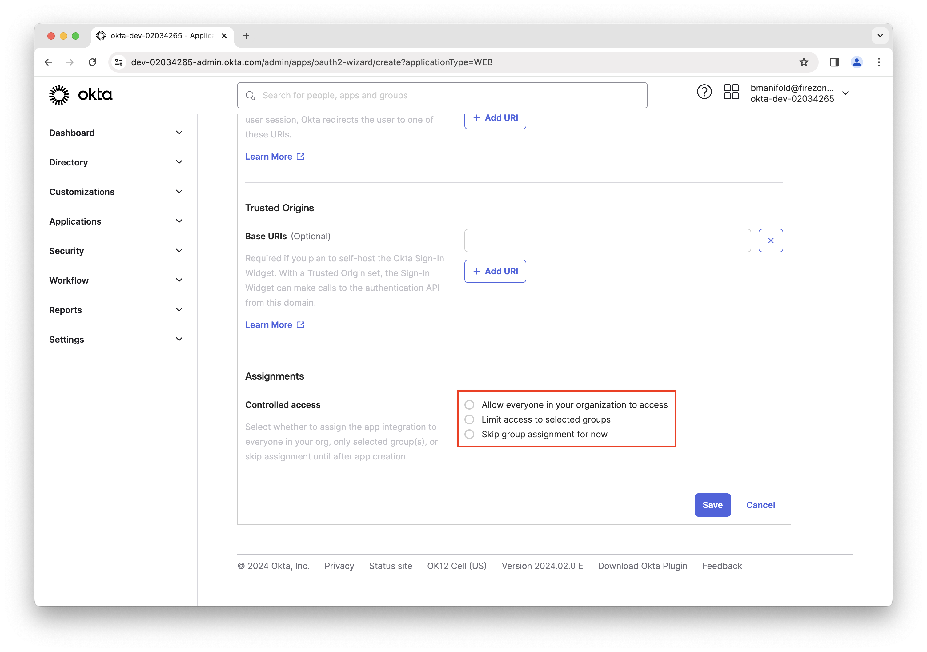 The user setting up this connector must have access to the Okta application being created. If you choose to "skip group assignment for now", please make sure your user is assigned to this Okta app before finishing the setup in Firezone.