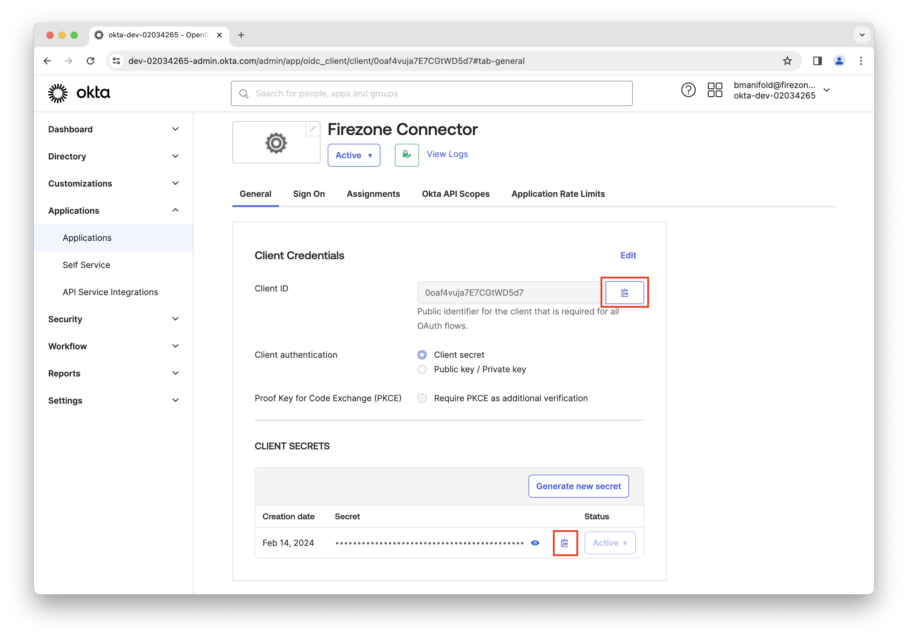 In the app integration settings in Okta, you'll find the Client ID and Client secret. Copy these values and paste them into the setup form in your Firezone admin portal.