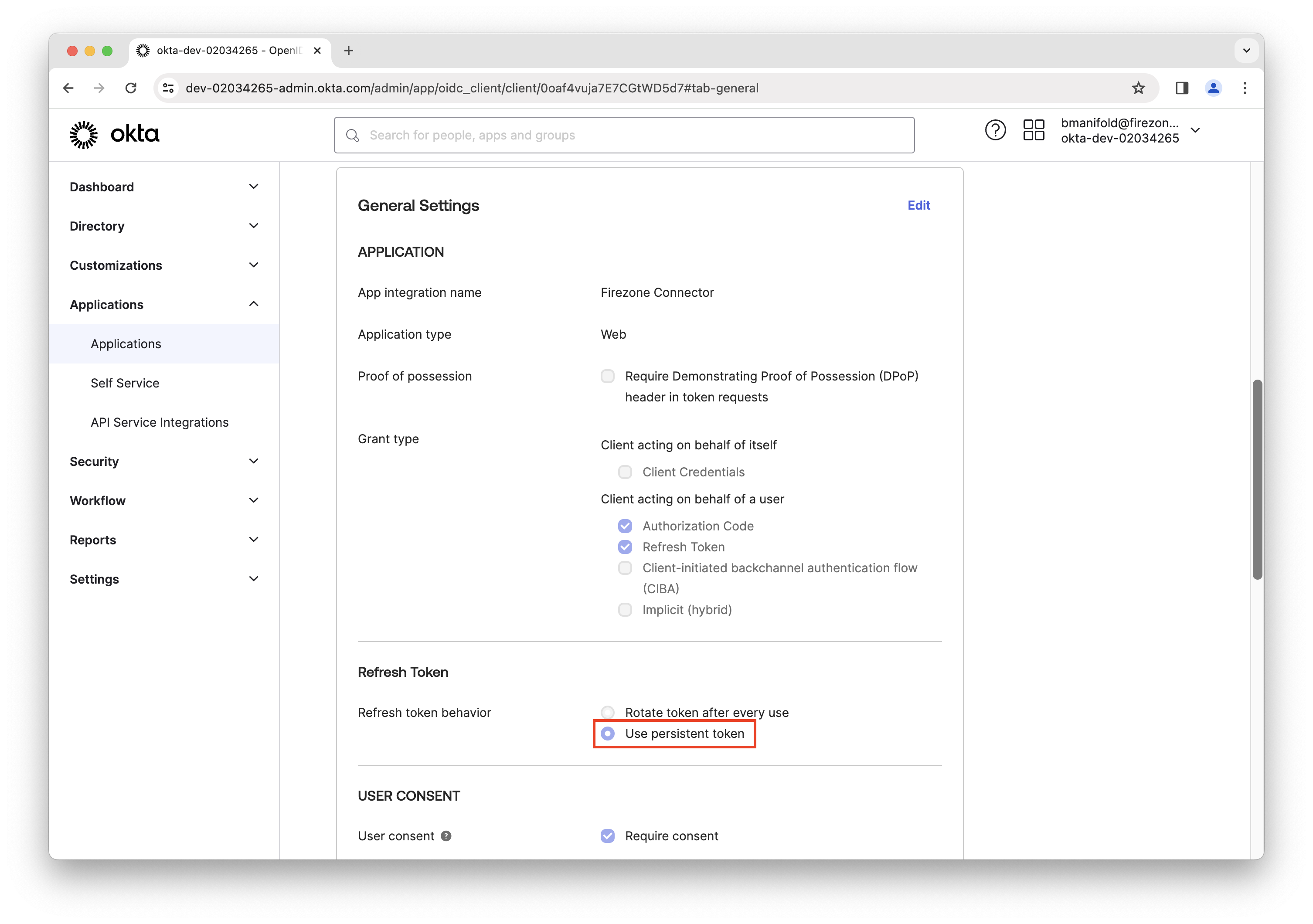 Scroll down to Refresh Token and ensure Use persistent token is selected.